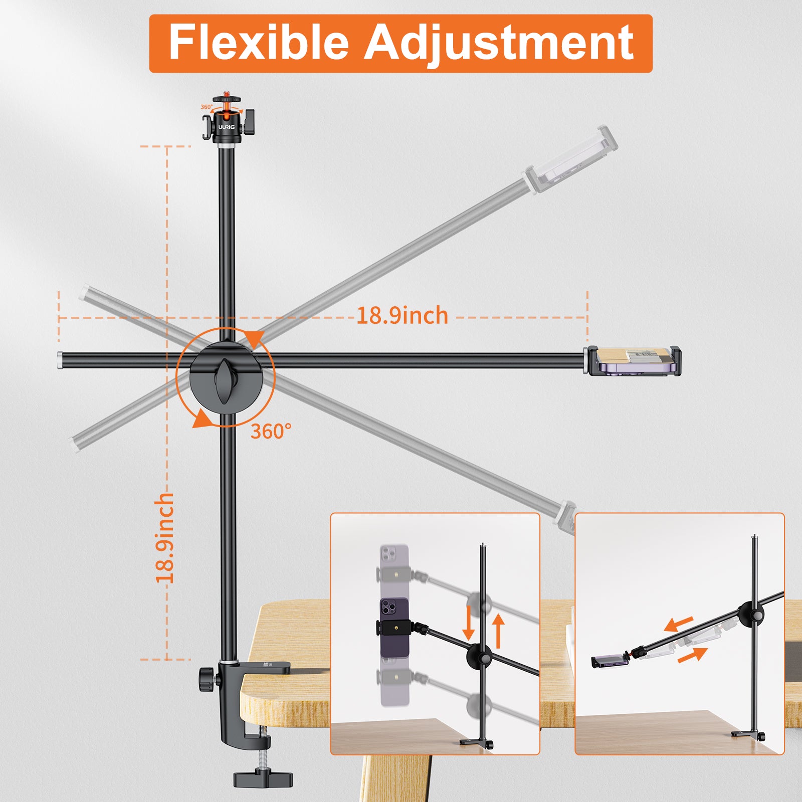 - 360° Ballhead adjust to any angle and 1/4" Screw allows you to expand your rig. And padded desk clamp expandable up to 5cm/1.96 inch.