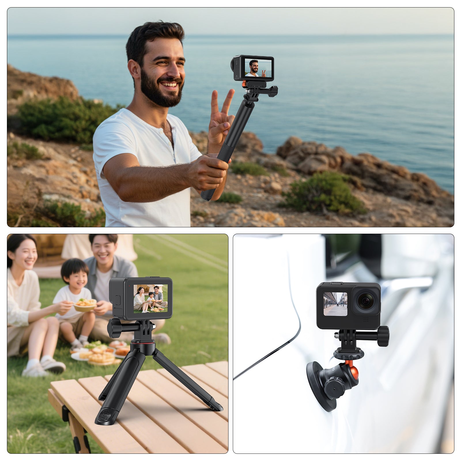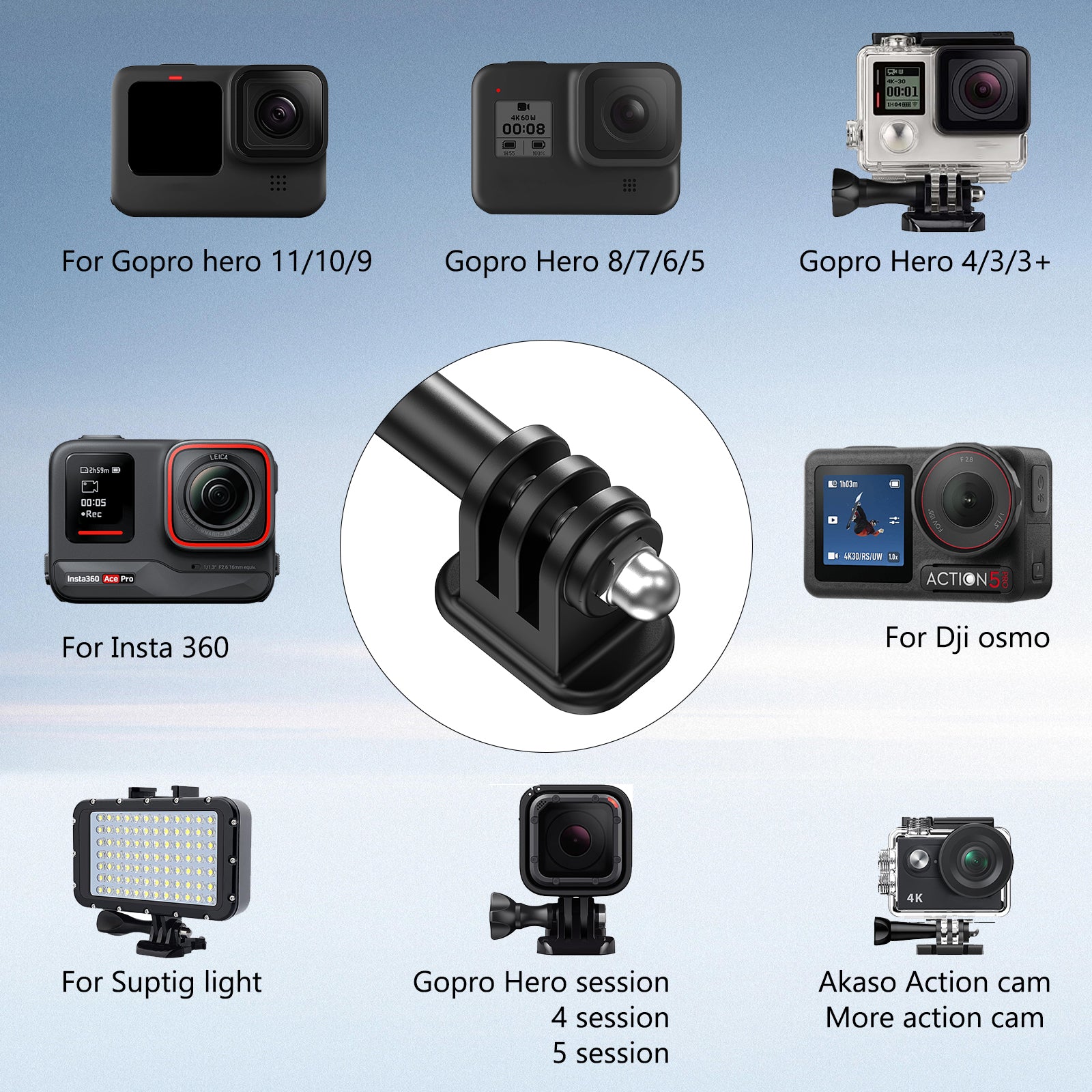 - [Suitable for Action Cameras]: The tripod mount compatible for go pro hero 13 12 1110 9 8 7 6 5 4 3, hero session, go pro max, go pro fusion, Dji osmo Action 5pro 3 2, insta 360, action cameras