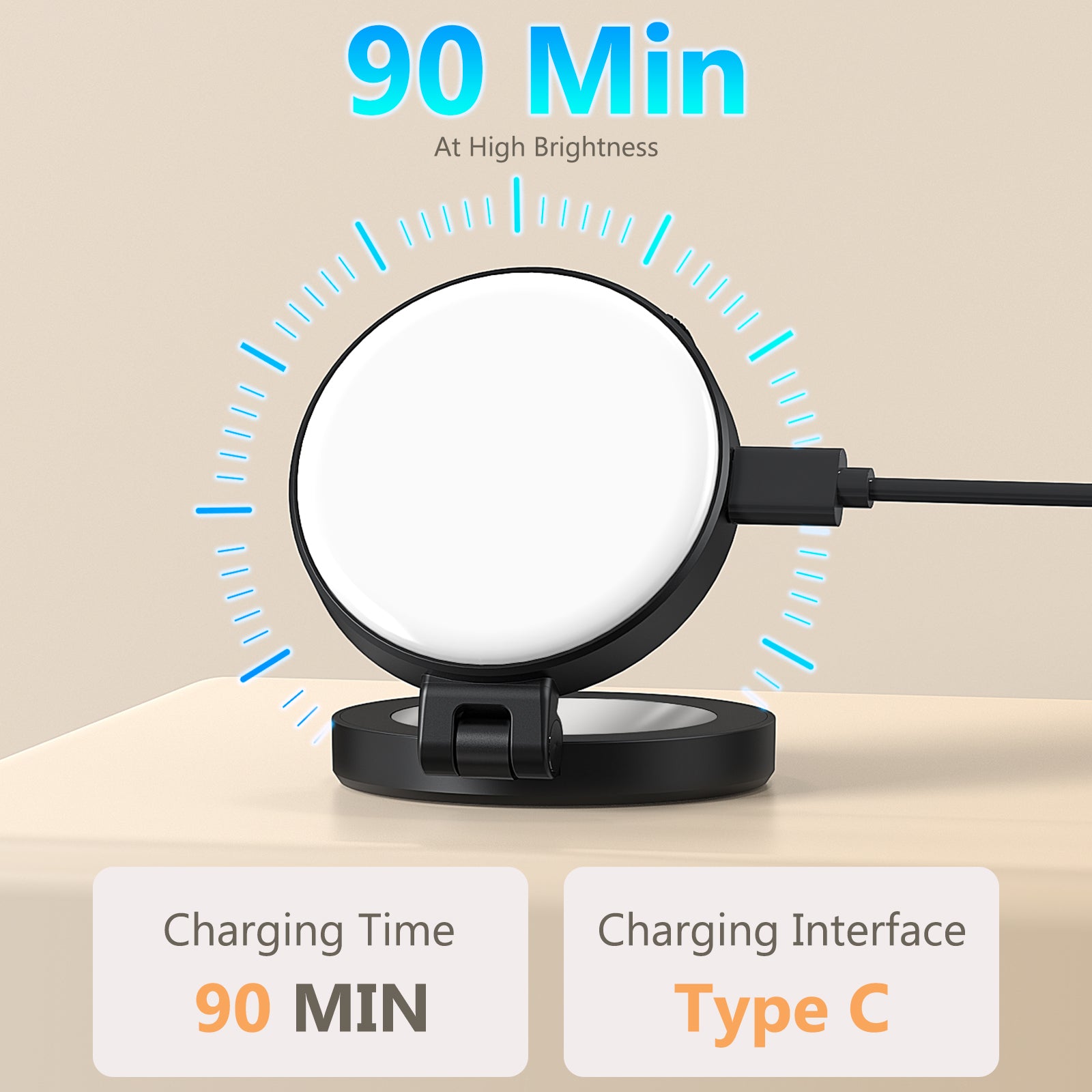 - [Built-in Long Life Battery]: The LED selfie light is powered by a 400mAh rechargeable battery that can be used continuously for up to 90 minutes at maximum power. Equipped with a USB Type-C charging cable with 5V/1A input, it can be fully charged in 90 minutes