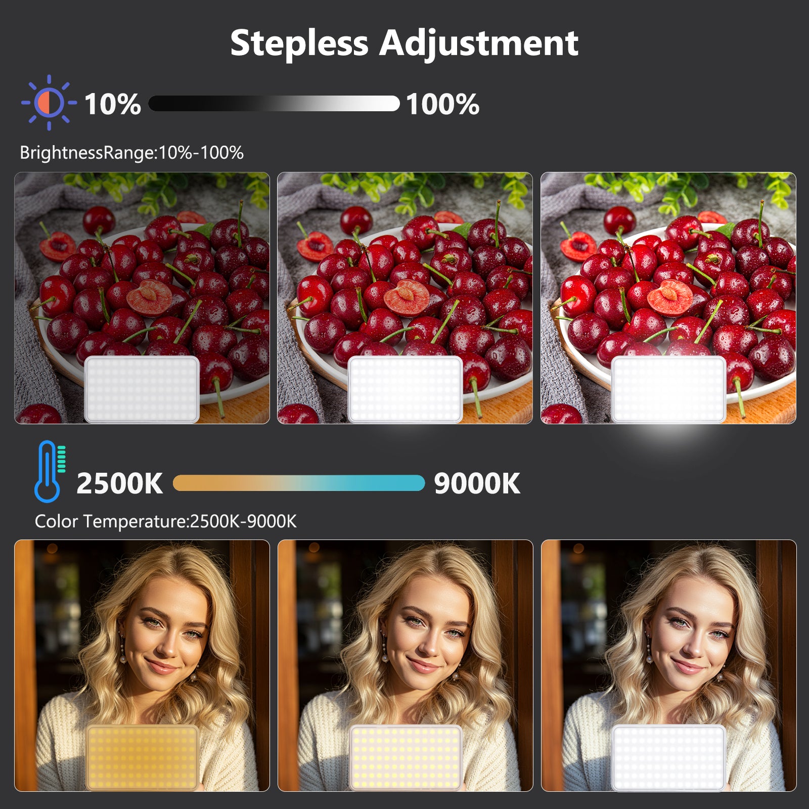 - Versatile CCT Color Mode: The LED on Camera Video Light offers a wide color temperature range from 2500K to 9000K, achieved with 98 high CRI LED beads. Easily adjustable brightness from 10% to 100% ensures you can achieve the perfect lighting for any scene.